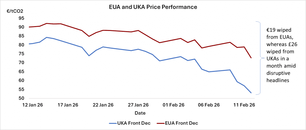 Following a bullish start to 2026, with EUA prices reaching a 31-month high at €93.80 and UKA prices climbing to a 33-month high at £75.45, both carbon markets have tumbled as a series of political and geopolitical headlines collided to precipitate an investor sell off.
