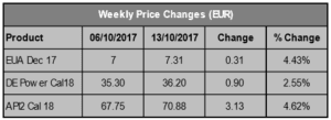 o law and render UK issued allowances from 1st January, 2018 invalid for compliance (see ‘Other news’ for more information). Following marathon trilogue talks (also see ‘Other News’) the deadlock on the final element of the Phase IV reform package continued and carbon opened lower on Friday morning. However, prices managed to claw back much of the losses through the rest of Friday demonstrating that last week’s EUA strength was not down to speculators anticipating a positive result. Relatively strong auction results also demonstrate that underlying demand is strong. And due to the current mixture of bullish factors traders are unlikely to help the market go down by running short positions for fear of further developments that have caused sharp price rises in recent weeks. Price Impact: that carbon can hold on to most of its gains last week despite weaker clean dark spreads and a failed trilogue tells us that underlying demand is strong for other reasons and means that continued gains cannot be ruled out.