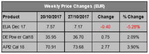 Christmas holiday. The weekend also saw the first cold snap of the 2017-18 winter and continued low temperatures will lend at least some support to carbon prices. But it seems much will depend on further Brexit developments. Based on available information we maintain our bearish outlook for the week ahead, in particular due to rumours that the UK plans to ask for an EU ETS transitional period (see ‘Other News’) that is separate from Brexit negotiations.